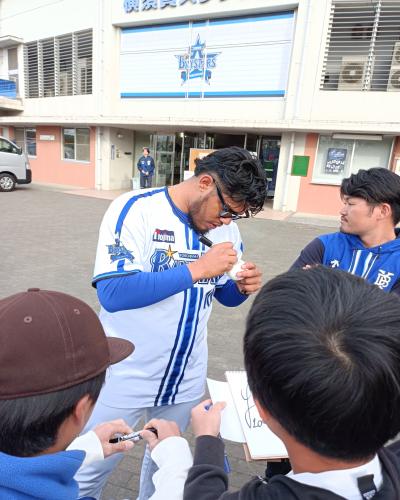 6月8日、DeNAの堀岡隼人投手とジョフレッグ・ディアス投手が横浜市内の横浜DeNAベイスターズ球団事務所で支配下登録の記者会見を行われました。 ジョフレッグ・ディアス投手は「真っすぐとフォーク、スライダーもツーシームも全部全部がいいです。ガンバリマス!アザス!」と育成5年目ということで、とても流暢な日本語を披露し、決意を新たにしました 横浜スタジアムで行われたプロ野球交流戦、横浜DeNAベイスターズVS福岡ソフトバンクホークスは3ー5出来た福岡ソフトバンクホークスが勝ちました。 ![]() 横浜DeNAベイスターズから福岡ソフトバンクホークスに移籍した嶺井選手がホームランを打ちました。 横浜DeNAベイスターズのジョフレッグ・ディアス投手が2点ビハインドの9回1アウト一、二塁から登板しました。支配下登録していきなり1軍デビューを果たし、無失点で抑え好投しました。 来日5年目のディアス投手は新しい背番号「93」が間に合わず、育成の背番号「109」のユニホームを着用しました。ブルペンから通訳と走ってマウンドへ向かいました。 いきなりピンチの場面での登板で、緒方選手に犠打を決められ2アウト二、三塁とされたが、続く柳町選手から空振り三振を奪い、大きな雄叫びをあげると横浜DeNAベイスターズファンから大拍手! ディアスは191センチ93キロの大型の左ピッチャー ディアス投手から頂いたサイン ![]() ![]() ディアス選手、応援しています! |