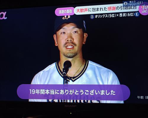 オリックス一筋、安達了一選手、小田裕也選手、T―岡田選手の引退試合(24日、埼玉西武ライオンズ戦 京セラドーム) 安達了一選手はオリックス一筋13年 ![]() 小田裕也選手はオリックス一筋10年 ![]() T岡田選手はオリックス一筋19年 ![]() 7回裏2アウトランナーなし T岡田選手、ライト前ヒット!! ![]() ![]() ![]() 9回裏2アウトランナーなし、T岡田選手、最後の打席 ![]() ライトへ物凄い当たり!! ![]() ライトスタンド5階席まで飛ばしましたが、わずかにファール ![]() 笑顔のT岡田選手 ![]() ![]() 最後は三振 ![]() ![]() 試合は埼玉西武ライオンズが9-2でオリックスバファローズに勝利しました。 今井投手9勝目!! 引退セレモニー ![]() ![]() オリックス一筋、安達了一選手、小田裕也選手、T岡田選手 素晴らしい活躍で楽しませていただきました。 ありがとうございました。 |