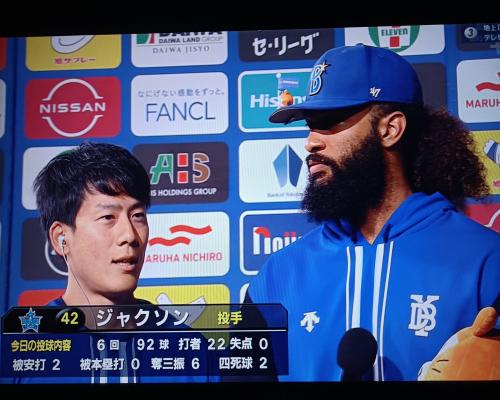 ジャクソン投手、快投で7勝目!!(25日、東京読売ジャイアン戦 横浜スタジアム) |