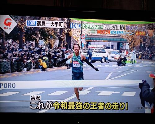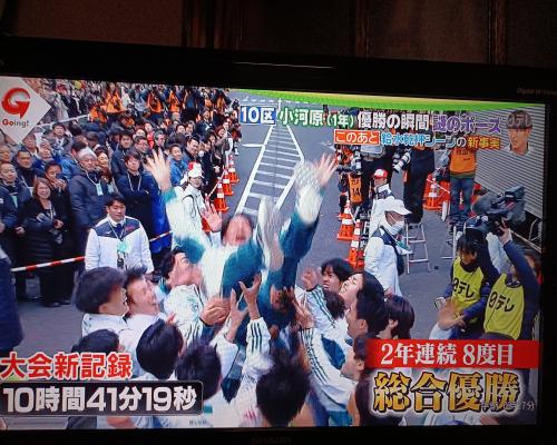 青山学院大学、総合優勝!!2年連続8度目!!!!!!!! 1年生のアンカー小河原選手 ![]() ![]() ![]() 大会新記録 10時間41分19秒 ![]() 4月からアナウンサーのキャプテン田中選手の胴上げ |