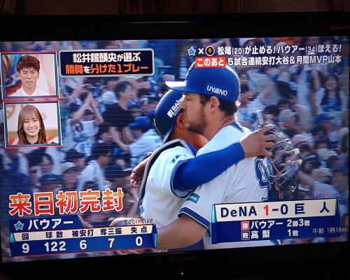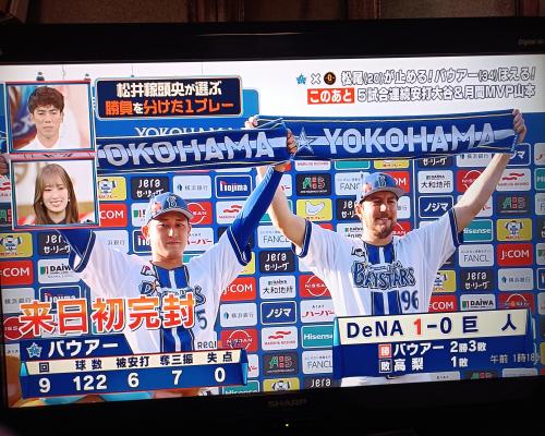 バウアー来日初完封!! ベイスターズ1−0巨人 3日、横浜スタジアム トレバー・バウアー投手が来日初完封!! ![]() ![]() 9回を122球、被安打6、奪三振7、無失点!! ![]() キャッチャー松尾汐恩選手と抱擁!! 松尾汐恩選手の好リード、バウアーを助ける3度の盗塁阻止!!! そして8回の決勝点となった犠牲フライ!!しかもこの日2安打!! ![]() ![]() ヒーローインタビューはもちろん、松尾汐恩選手とバウアー投手!! |