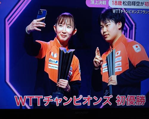 松島輝空選手、初優勝!! 松島輝空4−1ダン(ドイツ) WTTチャンピオンズフランクフルト 男子シングル 決勝 松島輝空選手、初優勝!!雄叫び!! ![]() ![]() 表彰式での早田ひな選手と松島輝空選手 ともにWTTチャンピオンズ |