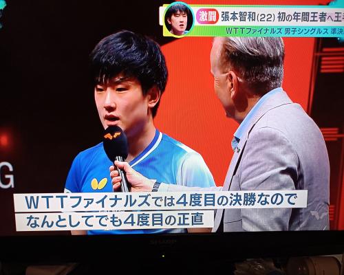 張本智和選手、試合後のインタビュー 張本智和4−3林詩棟 WTTファイナルズ香港 男子シングルス準決勝 14日、香港 |