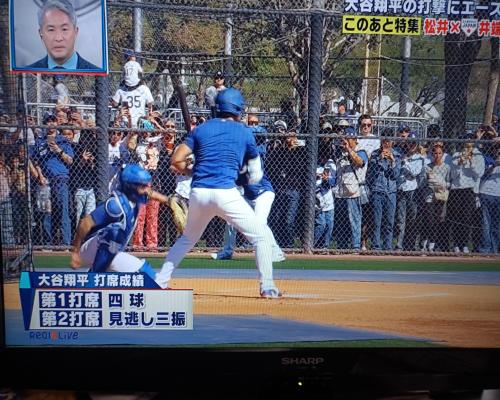 大谷翔平選手 初の実戦形式のバッティング ドジャースキャンプ2日目 ![]() ピッチャーはストーン投手 ![]() ![]() 大谷翔平選手 第1打席 フォアボール 第2打席 見逃し三振 豪快なスイングに観客はどよめいていました |