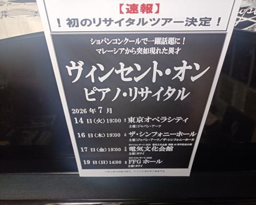 ヴィンセント・オンさん 初の日本ツアーが決まりました!! 第19回ショパンコンクール第5位 ![]() 第19回ショパンコンクール第5位受賞!! マレーシア人初のショパンコンクール入賞者!! 独特な演奏で話題をさらいました 日本でも大変人気があります!! ヴィンセント・オンさんの初の日本ツアーが決定!! ![]() 7月14日 火曜日の東京オペラシティコンサートホールはあっという間に完売!! 追加で急遽なんと 7月13日 月曜日の同じく東京オペラシティコンサートホールが決定されました!! 16日、大阪 ザ・シンフォニーホール 17日、名古屋 電気文化会館 19日、福岡 FFGホール という日本ツアー 14日の東京オペラシティコンサートホール以外はまだチケットがあるようです ヴィンセント・オンさんのファンの方々、ヴィンセント・オンさんのマニアの方々、ショパンコンクールのファンの方々、ショパンコンクールのマニアの方々、 ピアノを専門的に勉強しているすべての方々、ピアノをやっている勉強している子供から大人までのすべての方々、必聴必見の注目の演奏会です!! |