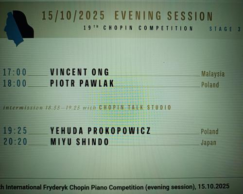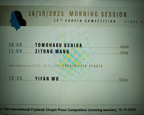 第19回ショパン国際ピアノコンクール 第三次予選 、2日目 午前の部 のコンペティターとプログラム 注目のティアンヤオ・リュウさん登場!!エリック・ルーがいない!?現地時間15日午前10時 日本時間15日午後5時
