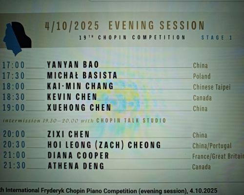 第19回ショパン国際ピアノコンクール 第一次予選 2日目 午後の部のコンペティターとプログラム 注目のケビン・チェンさん(カナダ)登場!! 現地時間4日午後5時 日本時間5日午前0時