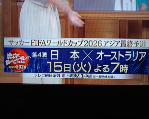 サッカーワールドカップアジア最終予選第4戦は、10月15日、火曜日、夜7時30分キックオフ、埼玉スタジアムで日本代表VSオーストラリア代表。