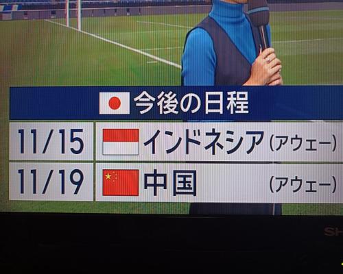 サッカーワールドカップアジア最終予選、日本代表の第5戦は11月15日インドネシア代表、第6戦は11月19日、中国代表。いずれもアウェー