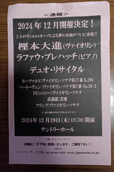 樫本大進さんとラファウ・ブレハッチさんの夢の共演が実現決定と発表されました!2024年12月19日、木曜日、19時開演 サントリーホール 続きを読む