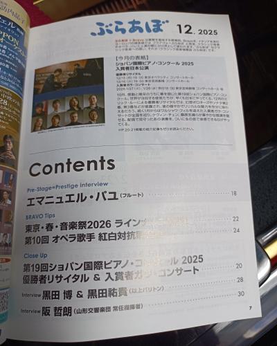 ぶらあぼ 12月号 7ページ目は目次 第19回ショパン国際ピアノコンクール2025優勝者リサイタル&入賞者ガラ・コンサートなど 続きを読む