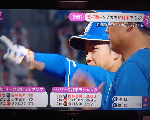 岡林勇希選手、セ・リーグ打率ランキング、安打ランキングで単独トップ!! 中日2−1西武 13日、ベルーナドーム