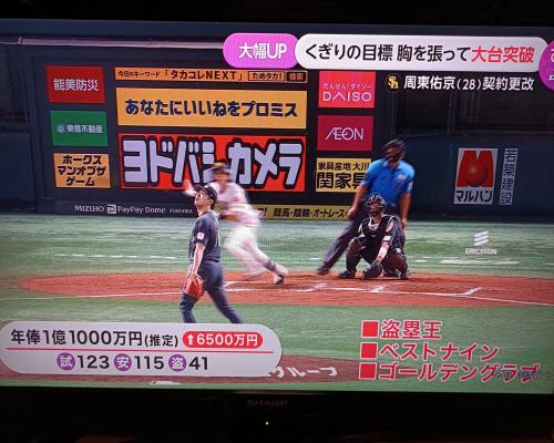 周東佑京選手(ソフトバンク)大台突破!!1億1000万円(6500万円アップ)